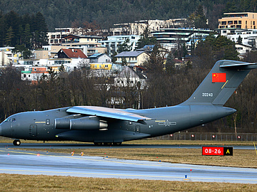 Bei besten Wetterverhältnissen landete um 08:49 Uhr das Luftfahrzeug vom Typ Xian Y-20, das anlässlich der Weltmeisterschaft der Gebirgsjäger nach Tirol kam. Es handelt sich bei diesem Typ um einen sogenannten Schulterdecker mit großem T-Leitwerk und vier Triebwerken, die sich unterhalb der Tragflächen befinden.