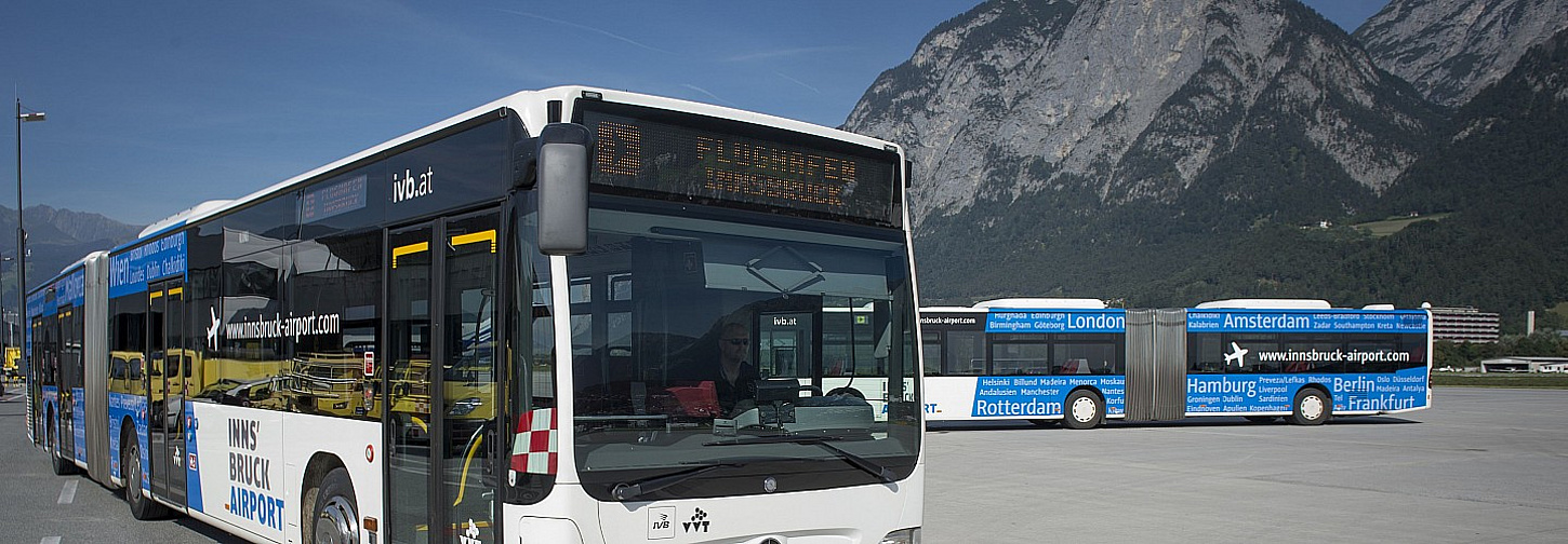Mit der Bahn bzw. dem Bus erreichen Sie den Flughafen Innsbruck einfach und bequem mit der Buslinie F. Die Fahrt dauert vom Innsbrucker Bahnhof bis direkt vor das Hauptgebäude des Flughafens etwa 20 Minuten.