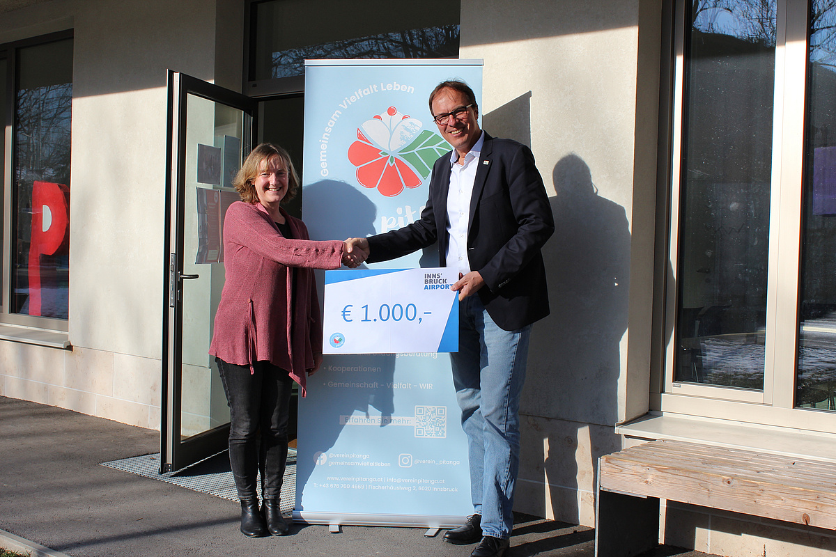 Im Januar besuchte Flughafengeschäftsführer DI Marco Pernetta den Verein pitanga in der Höttinger Au und überreichte der Vereinsvorsitzenden und Leiterin der Bildungsprogramme, Mag.a Ursula Jennewein, einen Scheck über EUR 1.000,- für das Lernprojekt „MEINE CHANCE“.