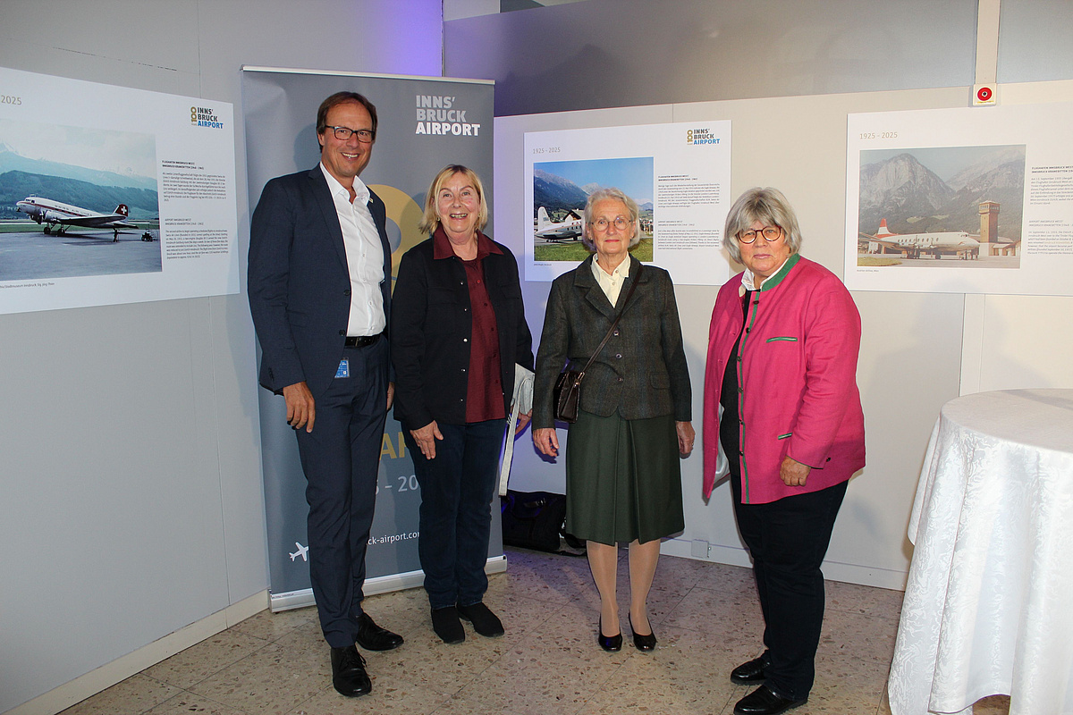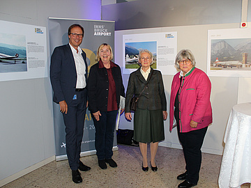 Bild 1 (von links nach rechts): Dipl.-Ing. Marco Pernetta (Flughafengeschäftsführer), Claudia Lantschner (Enkelin von Raoul Stoisavljevic), Beatrix Heppner (Enkelin von Alfred von Eccher), Dr. Tanja Chraust (Luftfahrthistorikerin)