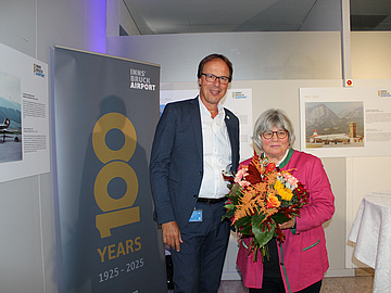 Bild 2: Flughafengeschäftsführer Dipl.-Ing. Marco Pernetta bedankt sich bei Dr. Tanja Chraust und überreicht ihr einen Blumenstrauß